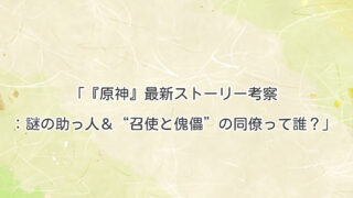 ゲーム 「『原神』最新ストーリー考察:謎の助っ人&“召使と傀儡”の同僚って誰?」 「原神」では、アップデートごとに新章・新展開が発表され、プレイヤーの間で多くの謎や考察が生まれています。特に最近のストーリーでは、終盤に「謎の助っ人」が唐突に登場したり、“召使(サーヴァント)”と“傀儡(パペット)”にまつわる会話の中で「同... 2025.10.28 ゲーム